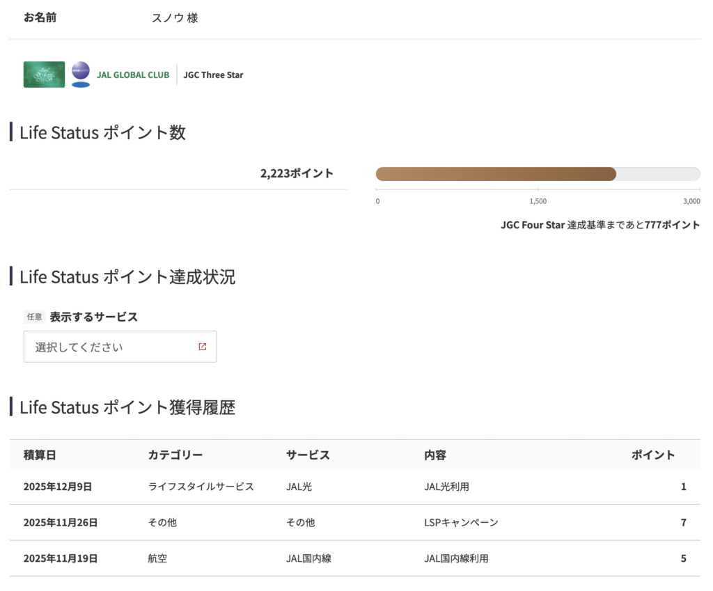 前回からまた2ヶ月経ちまして、コツコツ溜まり続けトータルのLife Status ポイントは2,223ポイントに到達!Four Starまであと