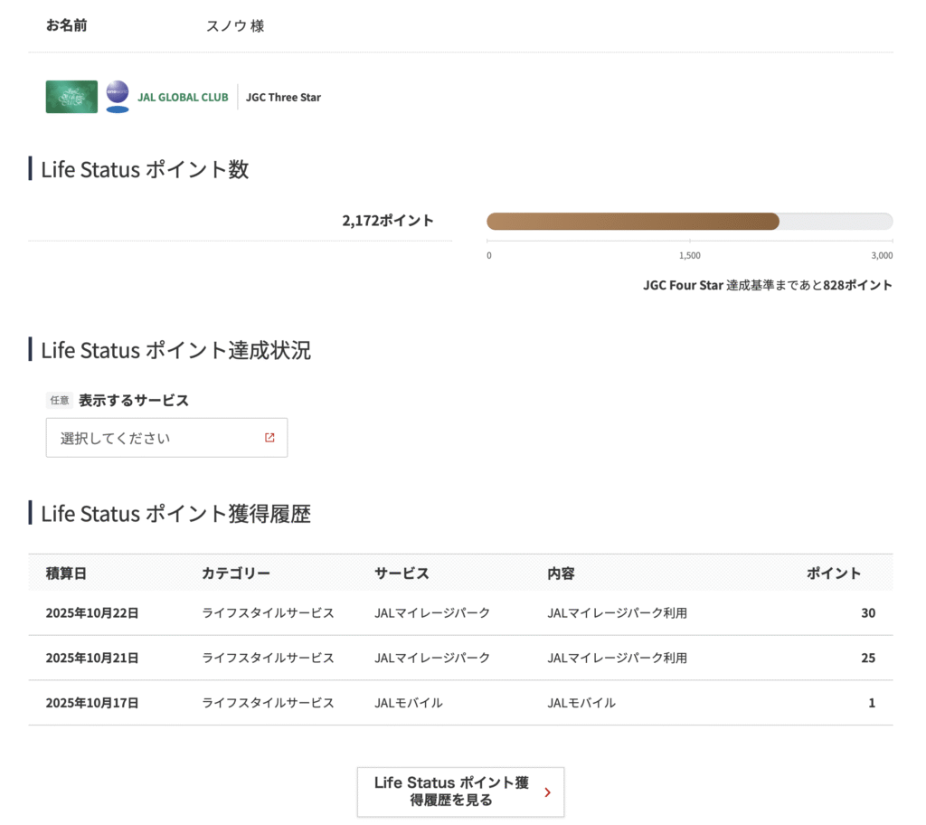 これで累計のLSPは2,172ポイントになり、JGC Four Starまであと828ポイントです。